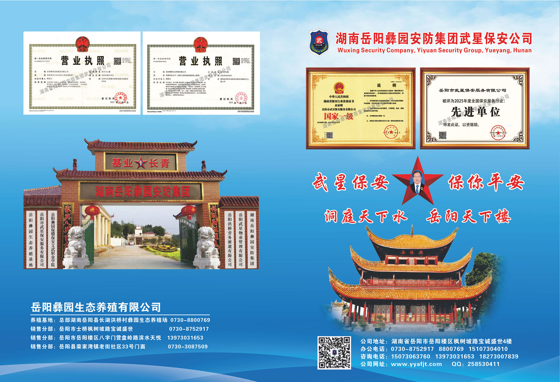 2017年6月正式成立了《岳阳彝园安防集团》,下设《武星保安公司》、《武星物业公司》、《洪桥劳务派遗公司》、《保镖保安武术职业培训学校》等子公司