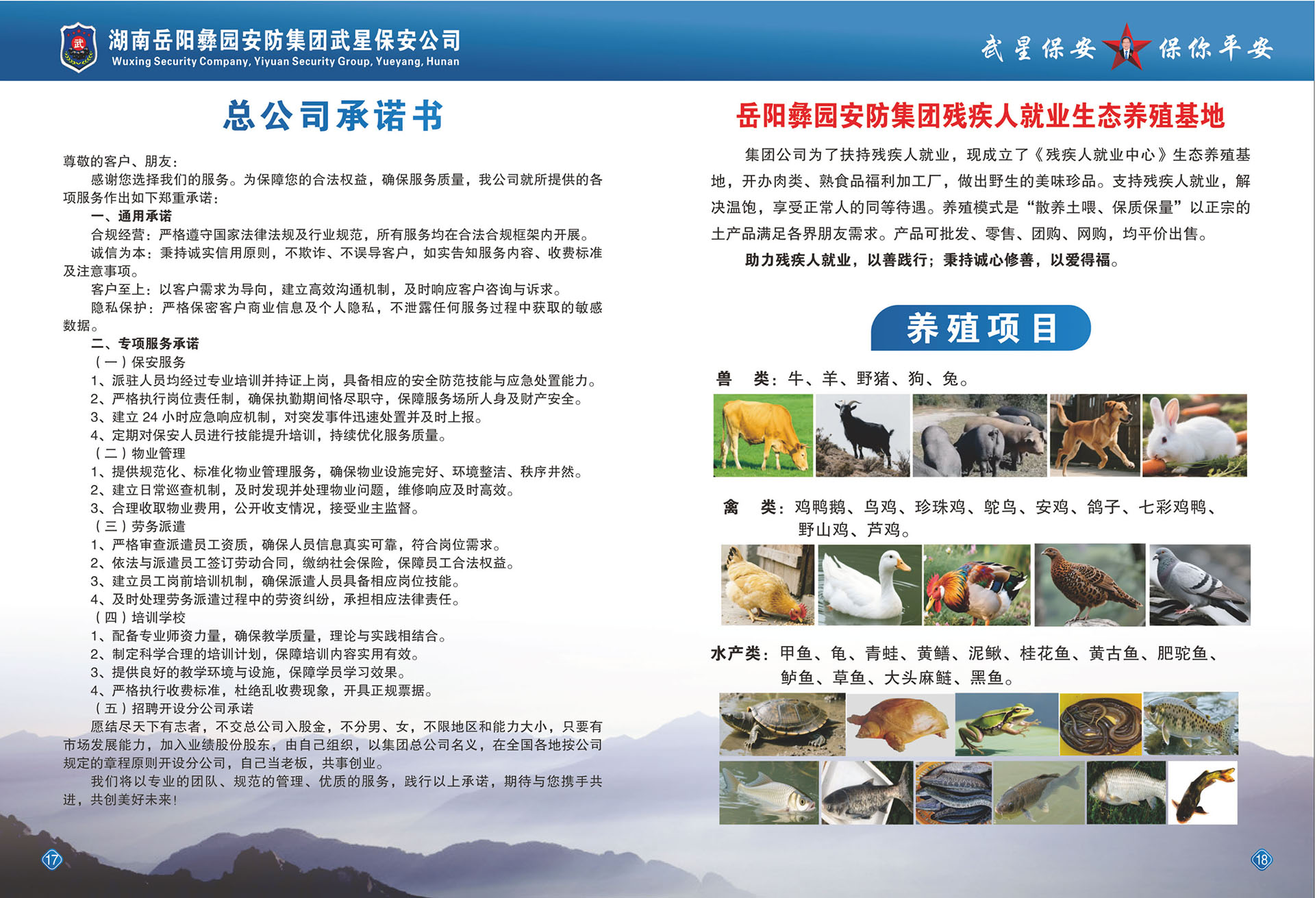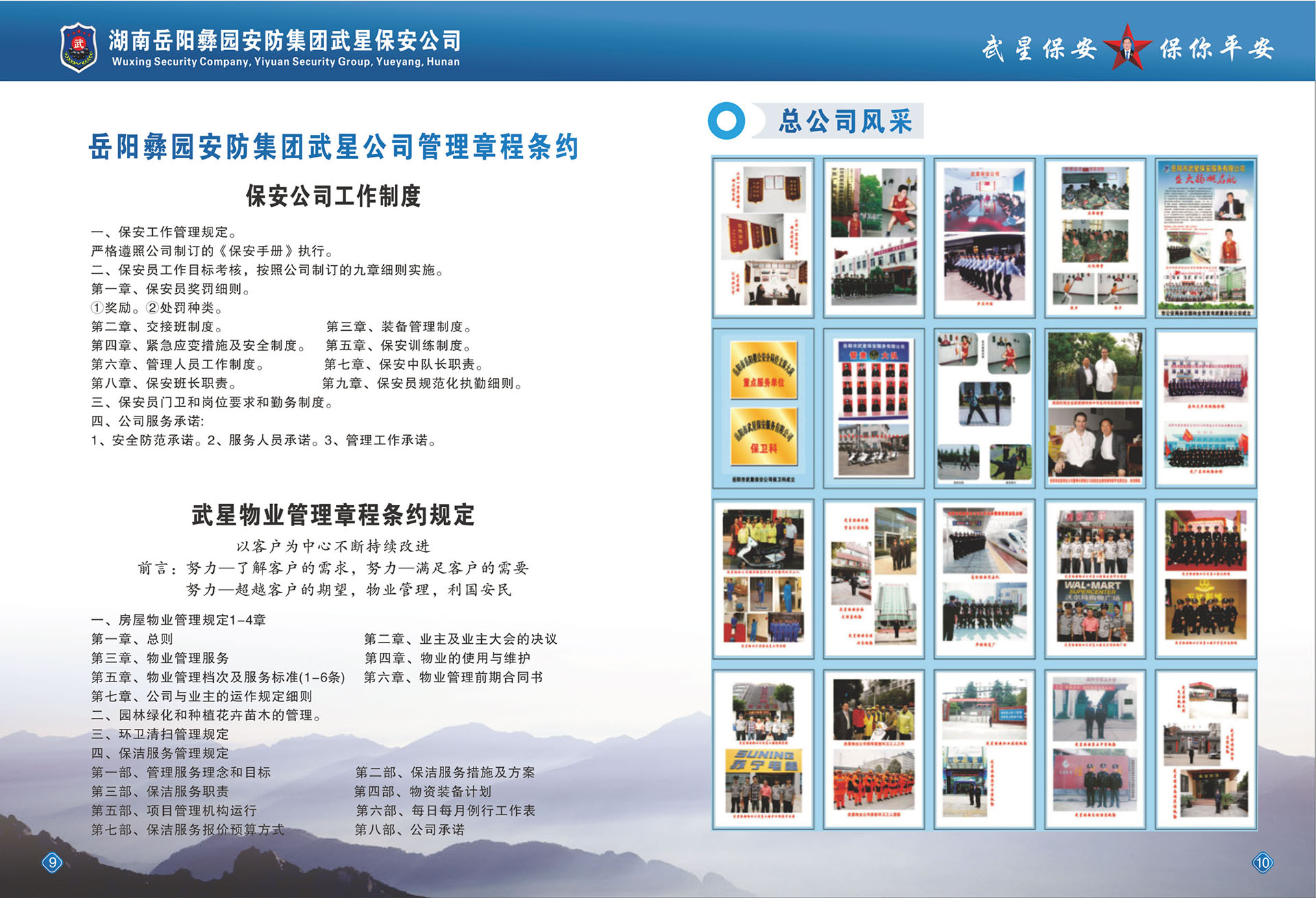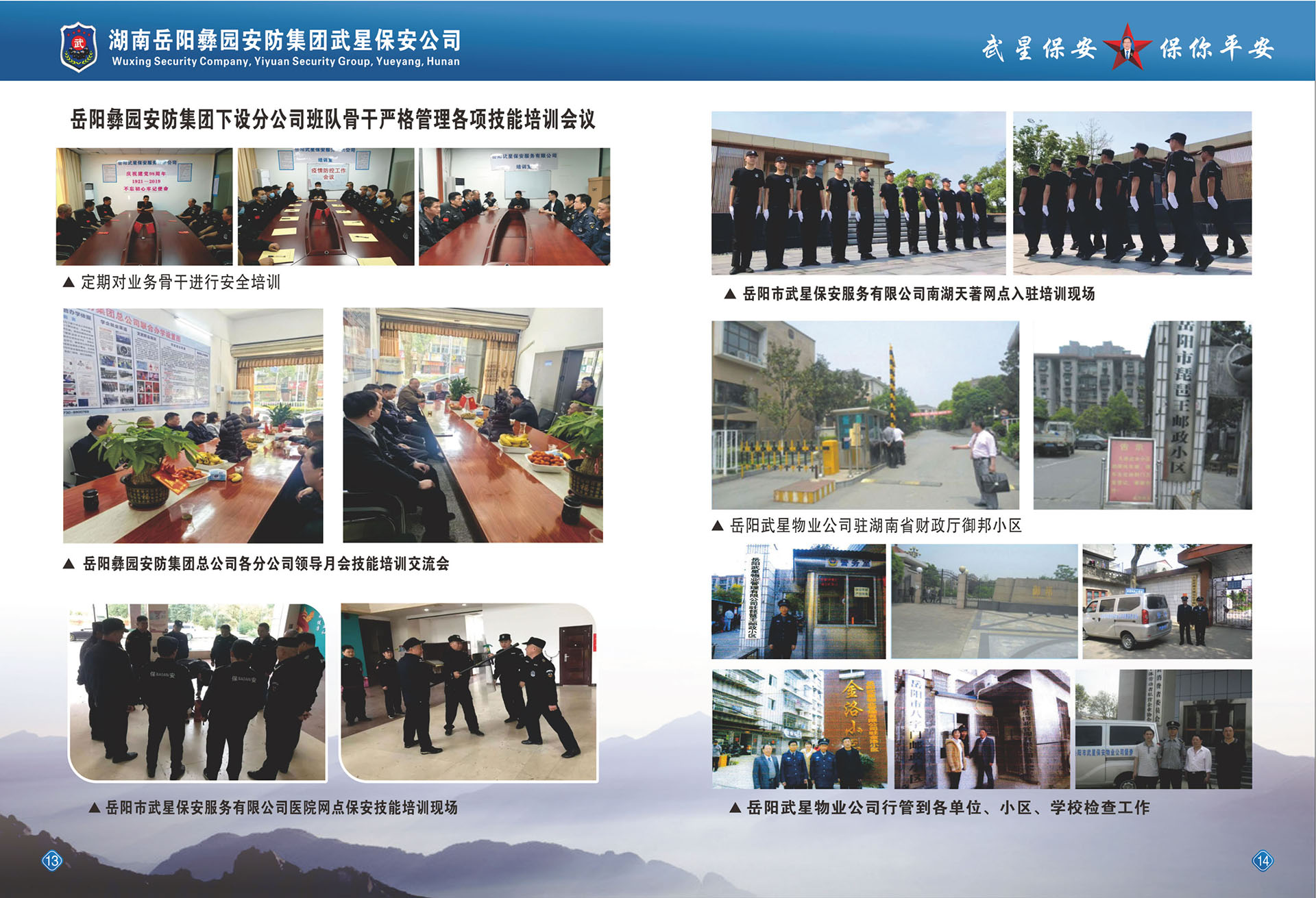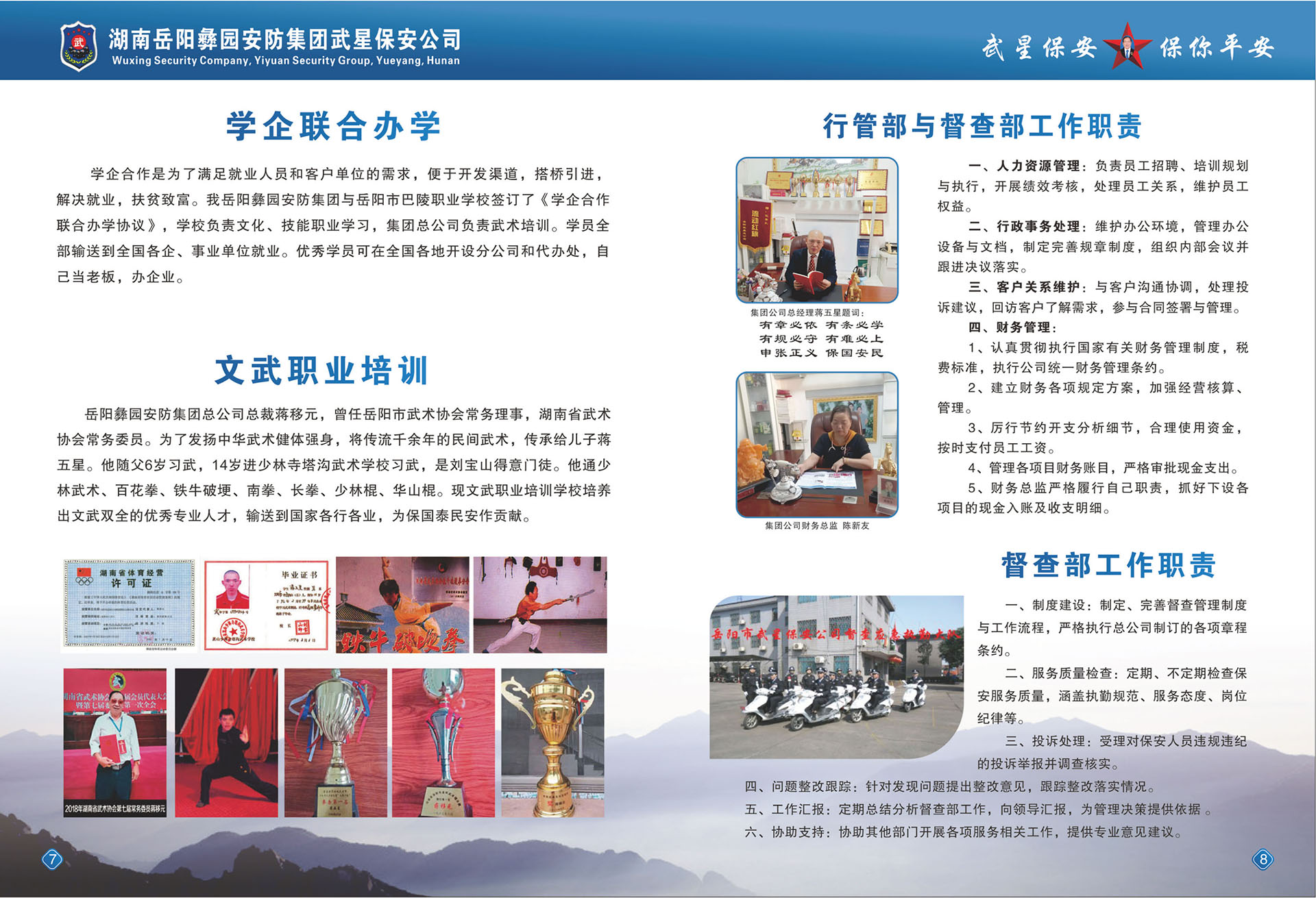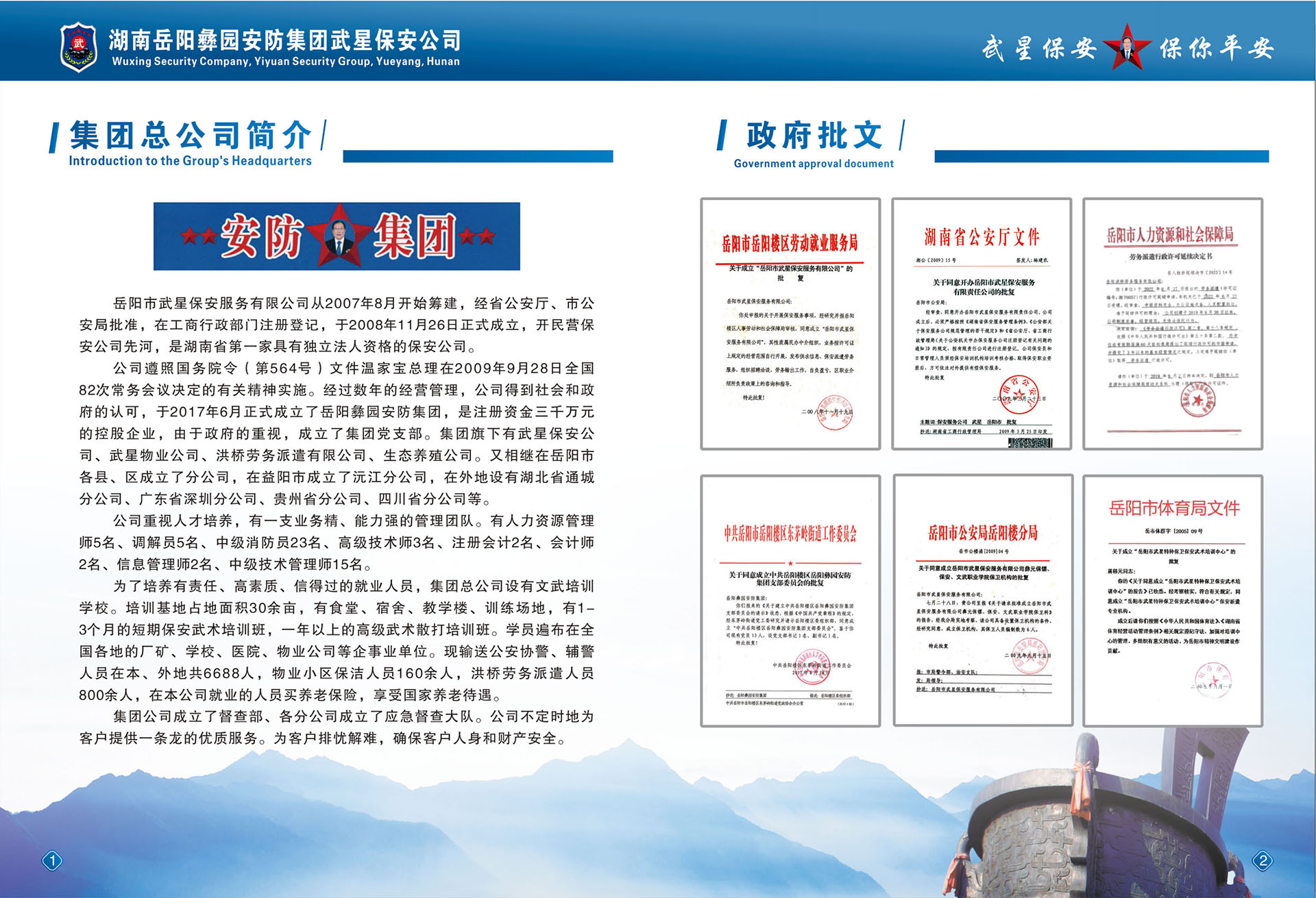 岳阳市武星保安服务有限公司,从2007年8月开始筹建。经省公安厅、市公安局批准,在工商行政部注册登记,于2008年11月26日成立,全国首创民营保安开先河,是湖南省试点第一家具有独立法人资格的民营保安公司。公司遵照国务院令(第546号)文件温家宝总理在2009年9月28日全国82次常务会议决定的有关精神,经过数年的经营管理,得到社会和政府的认可,于2017年6月1日正式成立了《岳阳彝园安防集团》注册资金:三千万元,控股企业,成立了集团党支部。下设武星保安公司、武星物业公司、洪桥劳务派遗公司、永红物业公司、集团总公司与岳阳市新青年职业技术学校联合办学,学校占地面积三百于亩,可容纳几万学员,学校设施设备齐全,开设全日制高中班、中专班、函授大专、本科班及个类职业技术专业培训班,保镖、保安武术职业培训,办理各类证书,持证上岗,又相继成立了岳阳市六县五区分公司、湖北省通城分公司、广东省深圳分公司、贵州省分公司、四川省分公司、益阳市沅江分公司等全国各地开设有十几家分公司。为了培育文武优秀人才、武术职业学校有1-3个月短期保安武术培训班,一年以上的高级武术散打培训班,分布在全国各地厂矿、学校、医院、物业公司等企事业单位安排就业,现输送公安协警辅警人员在岳阳外省共6688人,物业小区和保洁职工160余人,洪桥劳务派遣输送各地企事业共800余人,职业培训学校长年全国各地招生学员。集团总公司基地占地面积30余亩,已创建培训学校有食堂、宿舍、教学楼、训练场地几千平方米。公司于2009年9月得到楼区政协委组织奖、《楼区公安分局经文保重点服务单位》、2015年被评为《岳阳市第四届富民强市新闻人物模范单位》、2016年被评为《深圳市公安局先进保安组织单位》《2017年广东省湖南临湘商会副会长单位》,服务质量得到社会上各届客户的好评。集团公司成立了督查部,各分公司成立督查应急大队。公司注重人才,有人力资源管理师5名、调解员2名,中级消防员23名,高级技术工程师5名、注册会计师1名、会计师2名、各分公司会计数名、信息管理师1名、中级技术管理师 15名。公司不定时地为客户提供一条龙的优质服务,确保客户人身和财产安全,时时为客户排忧解难。解决剩余劳动力和就业,入学学员全包就业。买养老保险,享受国家退休养老待遇。
